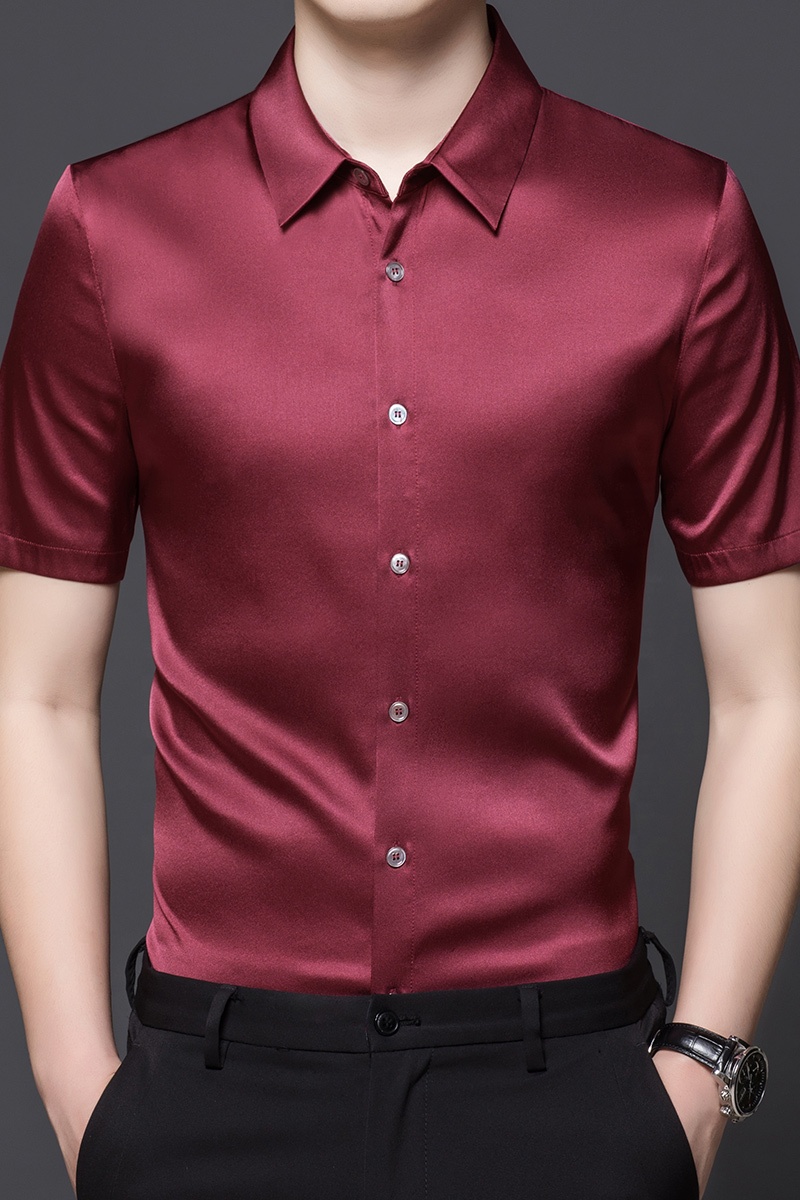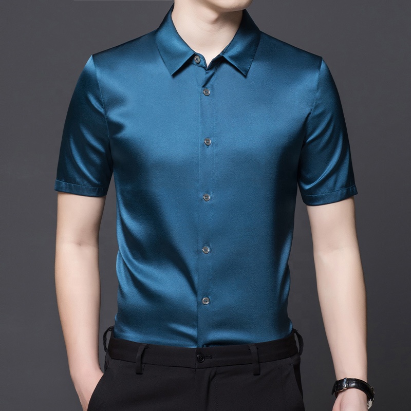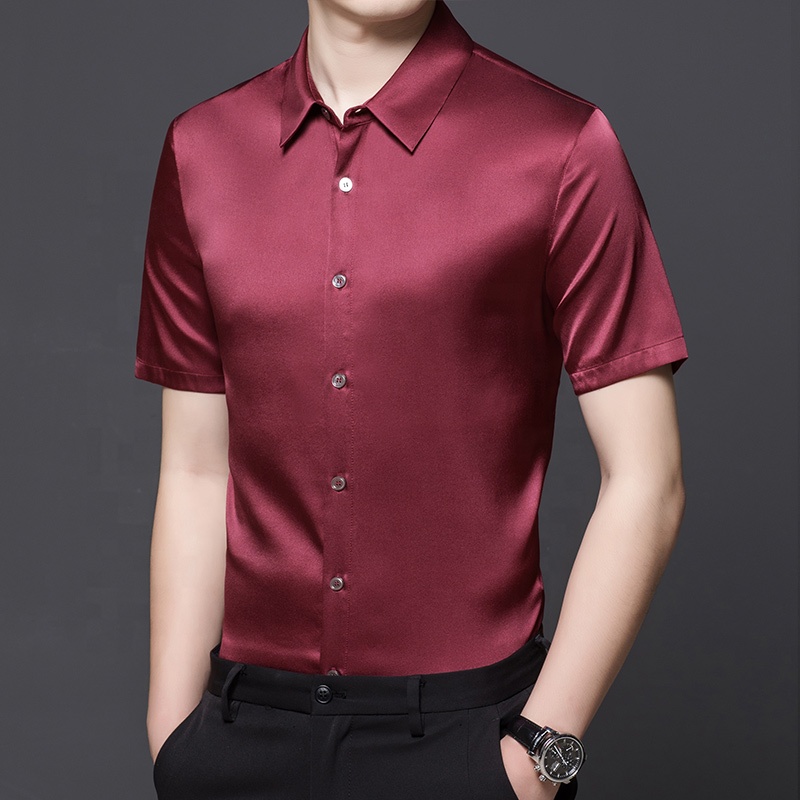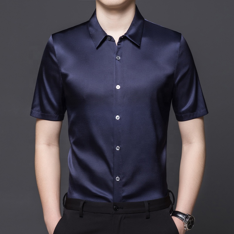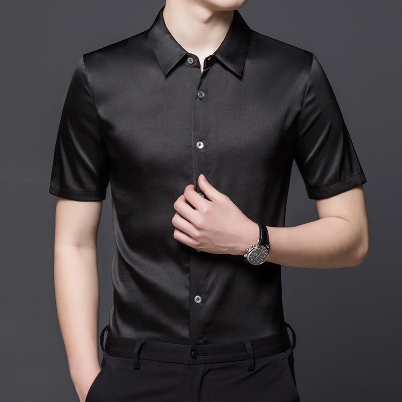 2024 High Quality Business Stand Collar Silk Shirt For Men Solid Color 90.4% Silk Short Sleeve Men 's Shirt