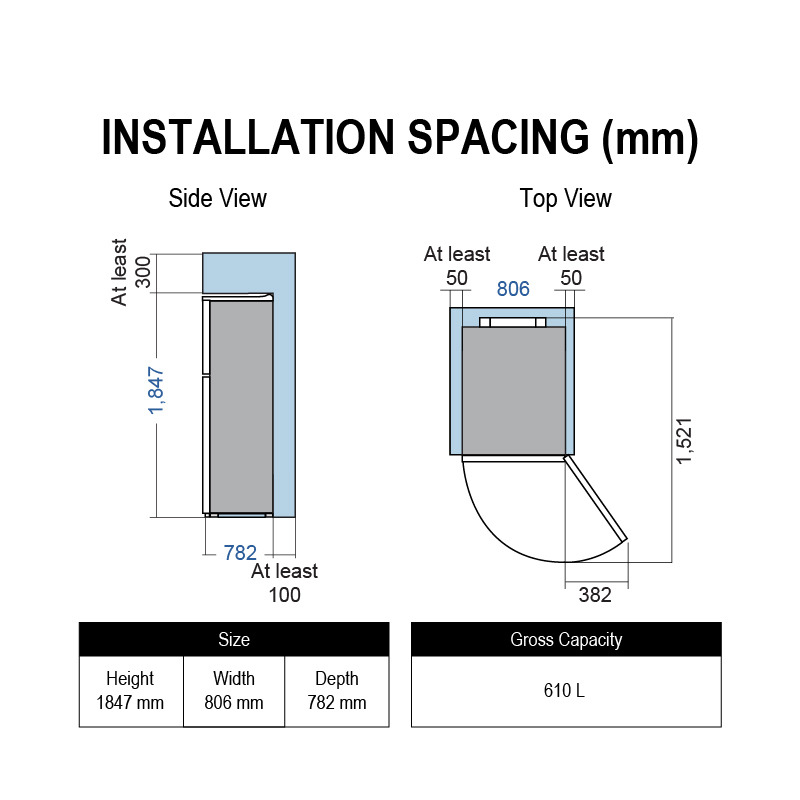 H: 1847 mm, W: 806 mm, D: 782 mm, Weight: 82 kg. *Please refer to the layout drawing for checking minimum requirement of installation.