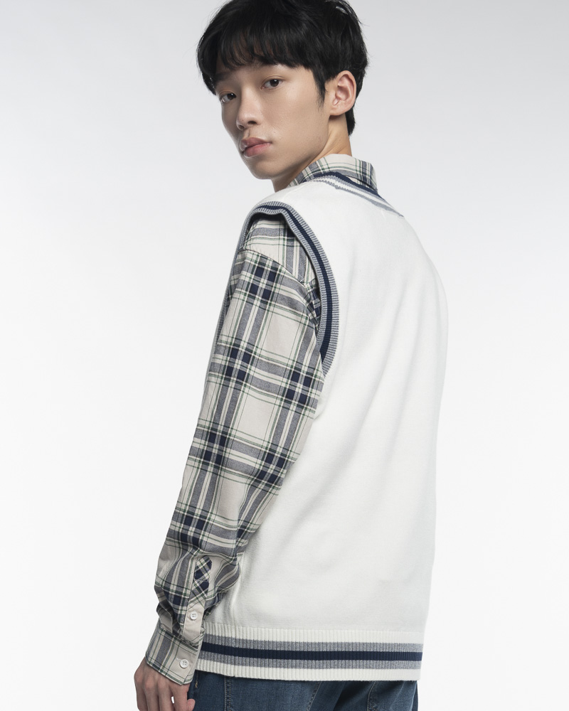 Regular Knitted Round V Varsity Vest With Asymmetrical Contrast Coloured Neckline and Hem. Comes with Letter P Embroidery at the front. Made of cotton.